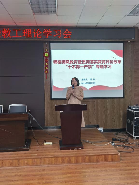 刘吟书记领学师德师风教育暨贯彻落实教育评价“十不得一严禁”专题学习。她围绕《深化新时代教育评价改革总体方案》和“十不得一严禁”负面清单,结合学院工作实际,就“学校评价、教师评价、员工评价”等内容进行深入学习研讨,做到教师、管理人员全覆盖。