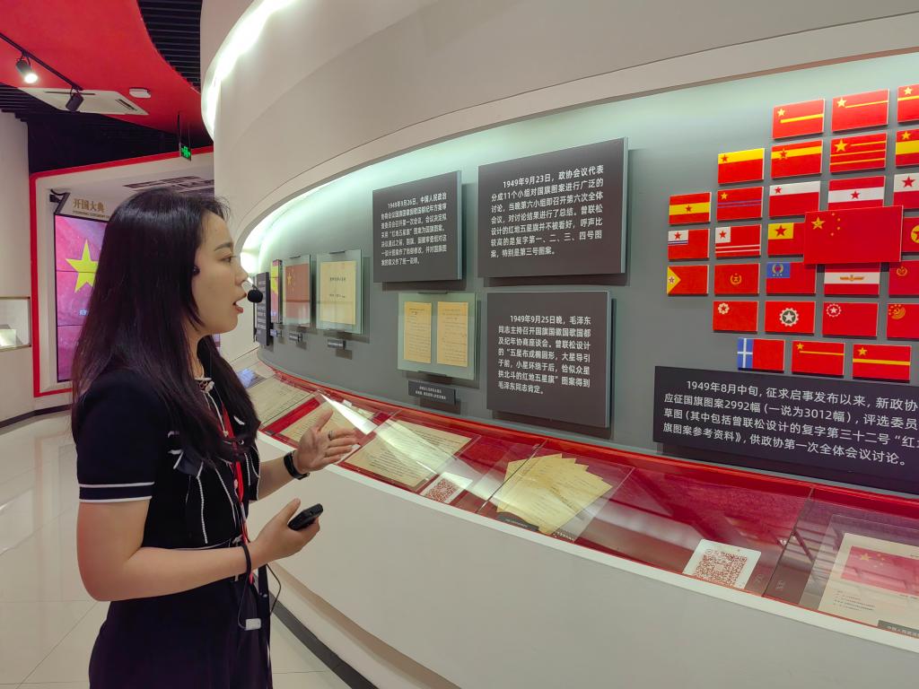 通过馆中的多媒体声光设施以及在讲解员的讲解下,实践队员们充分了解到了国旗的由来以及背后的含义。展厅共有三层,其中包括国旗的设计者曾联松先生的雕塑以及国旗教育馆的镇馆之宝——一面曾在北京天安门广场升起的国旗。