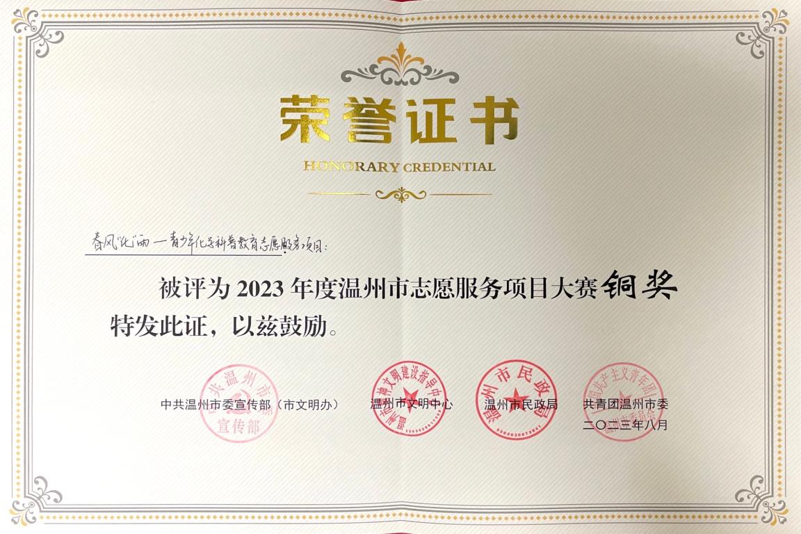 公司申报的春风“化”雨——青少年化学科普志愿服务项目与温州各地方选送的项目同台竞赛,最终获得2023年度温州市志愿服务项目大赛铜奖!