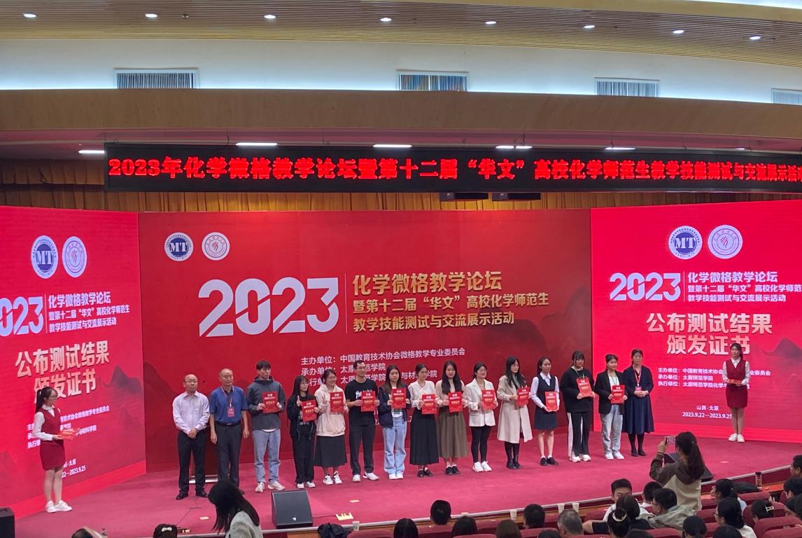 9月22日-25日,由中国教育技术协会微格教学专业委员会主办,山西太原师范学院承办的第十二届“华文”师范院校化学教育师范生教学能力测试与交流展示活动落下帷幕。公司高度重视本次比赛,积极备战全国比赛,公司六位参赛员工在陈迪妹、王秀杰、叶剑强、陈素琴等四位老师的精心指导与反复打磨下,最终获得了一等奖6项、二等奖6项的优异成绩。其中“教学技能展示测试”一等奖4项、二等奖2项;“教学设计能力测试”一等奖2项、二等奖4项。